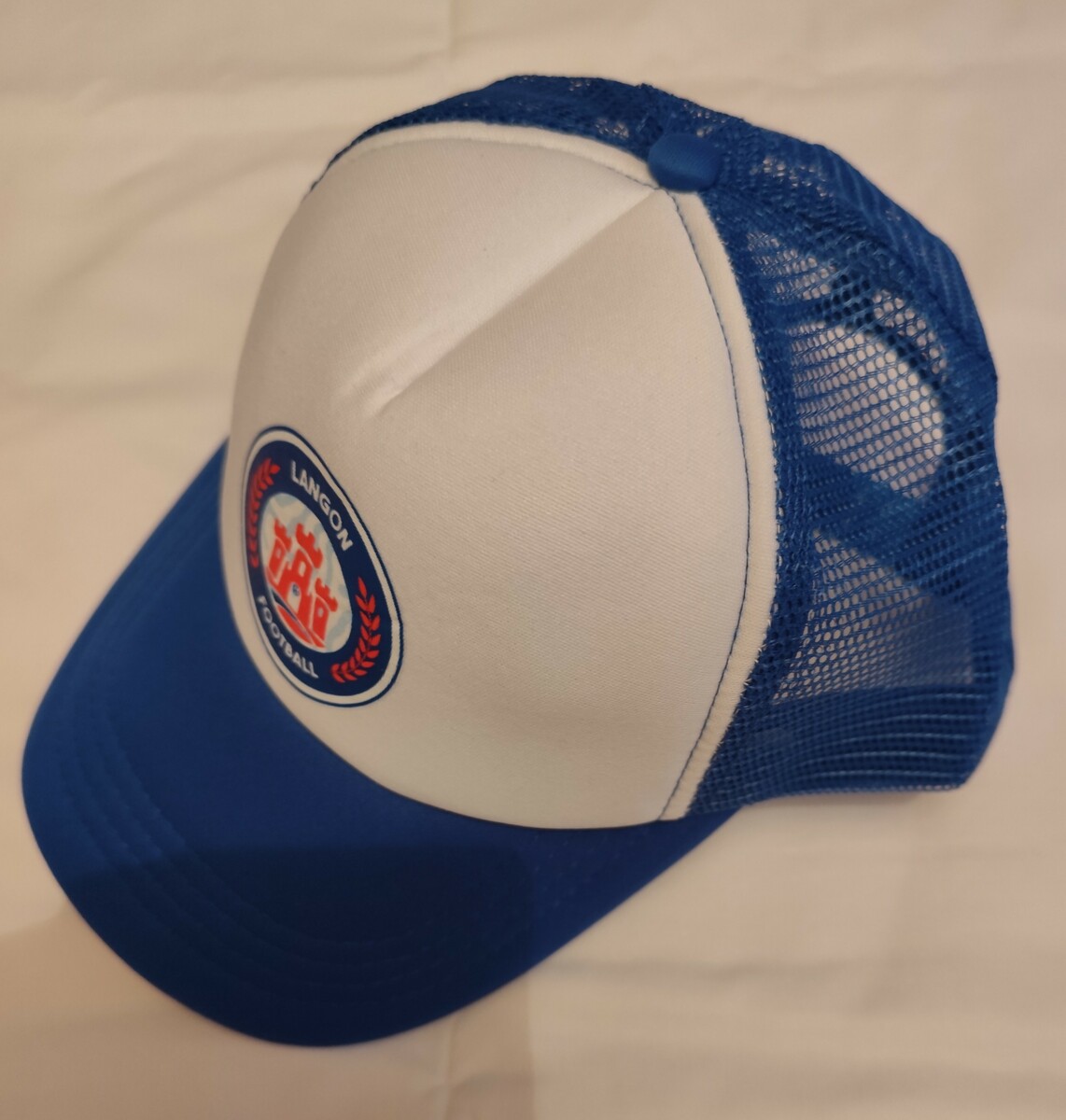 Casquette blanche et bleu avec le logo Langon Football floqué de la face avant.