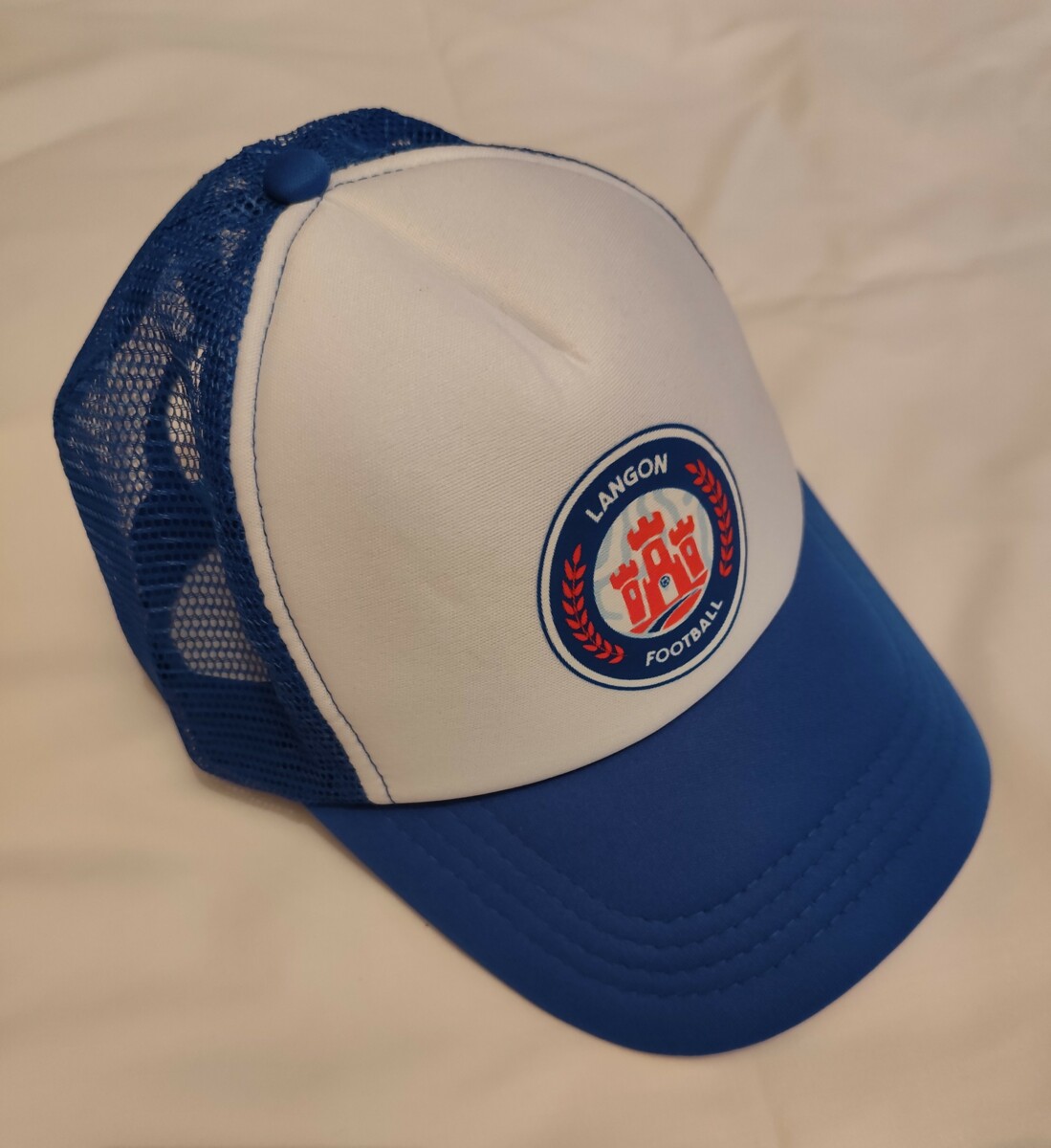 Casquette blanche et bleu avec le logo Langon Football floqué de la face avant.