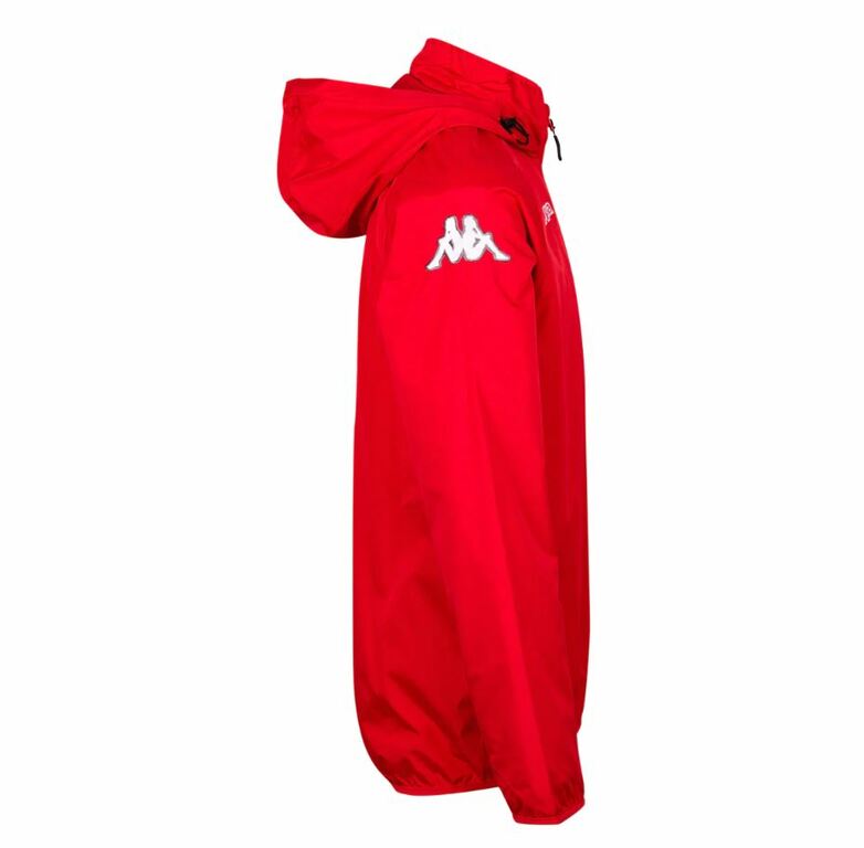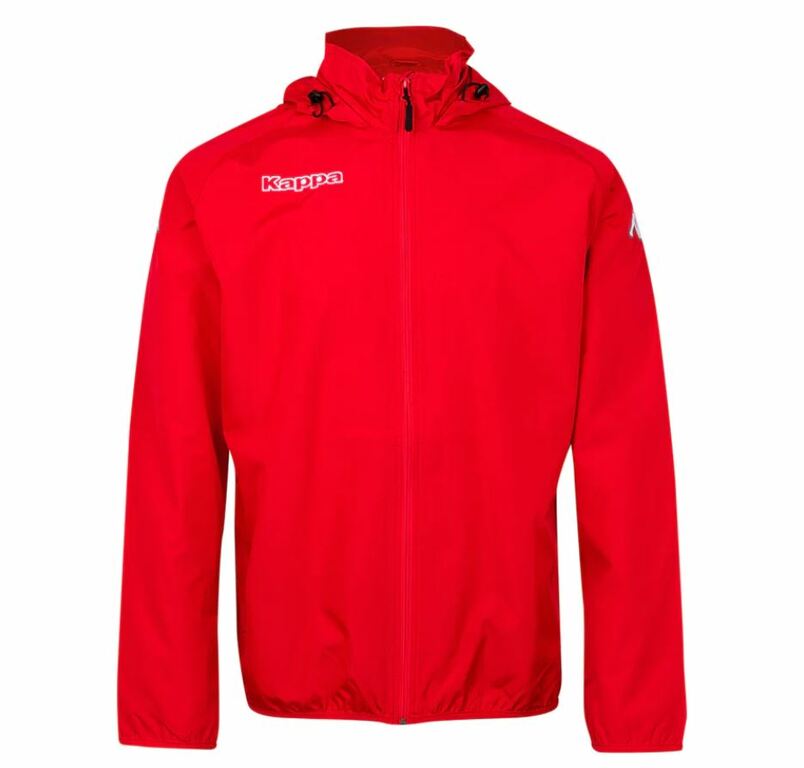 Veste imperméable rouge avec le logo Langon Football floqué sur la face avant gauche.